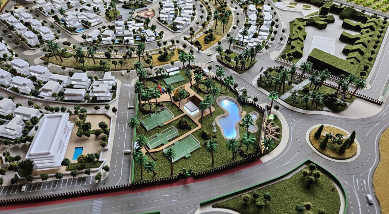 Esta es una maqueta de urbanismo a escala que representa un gran proyecto de desarrollo residencial, probablemente un complejo vacacional o una comunidad planificada.