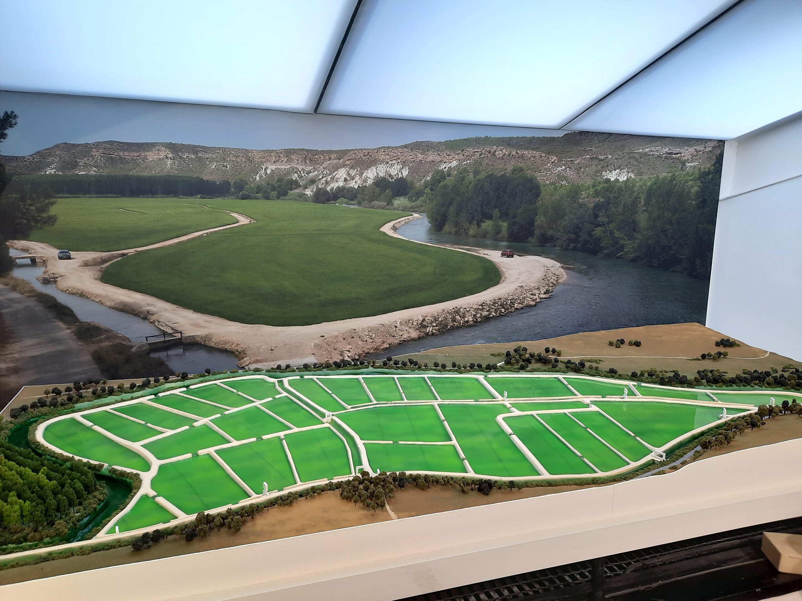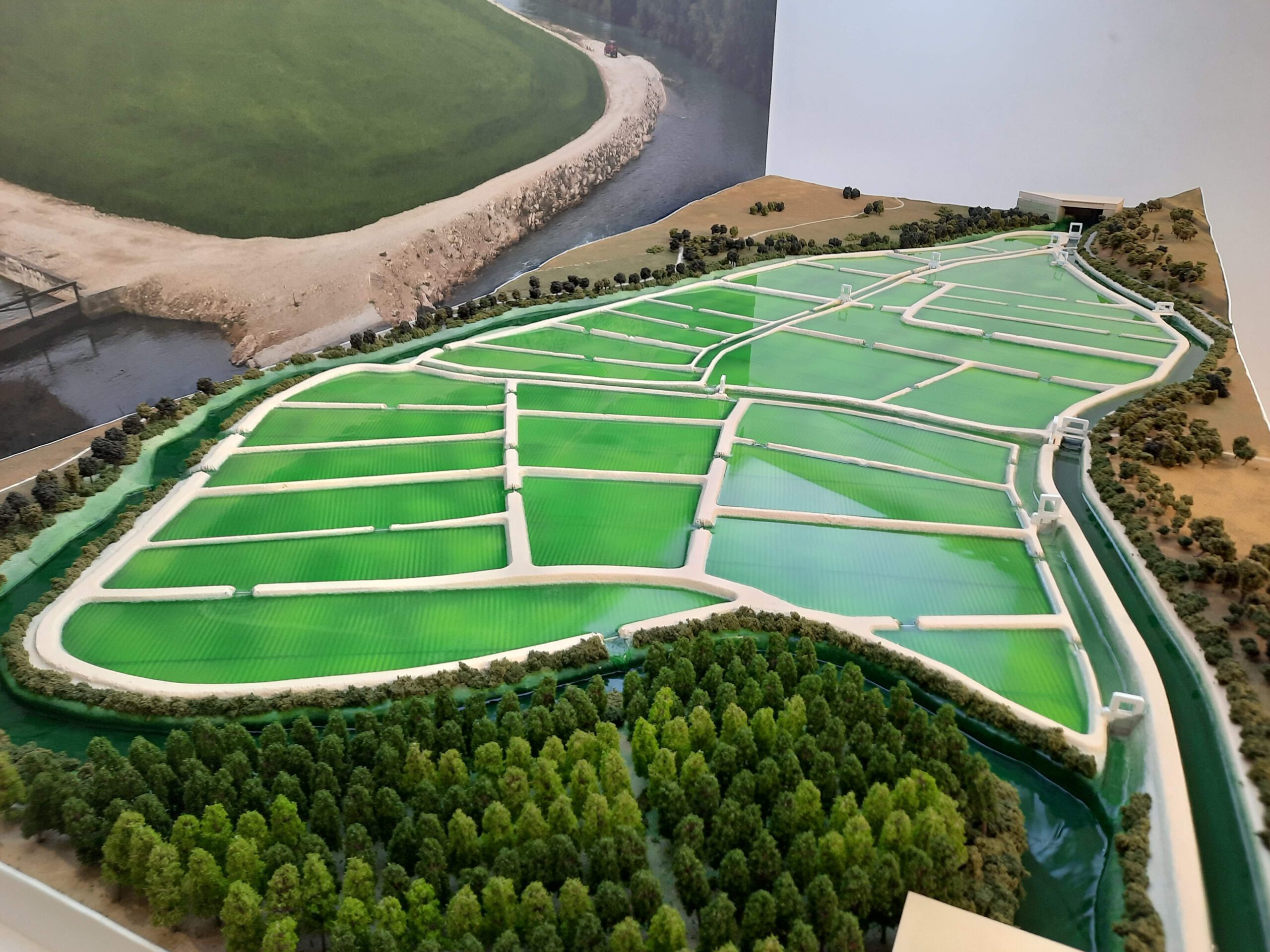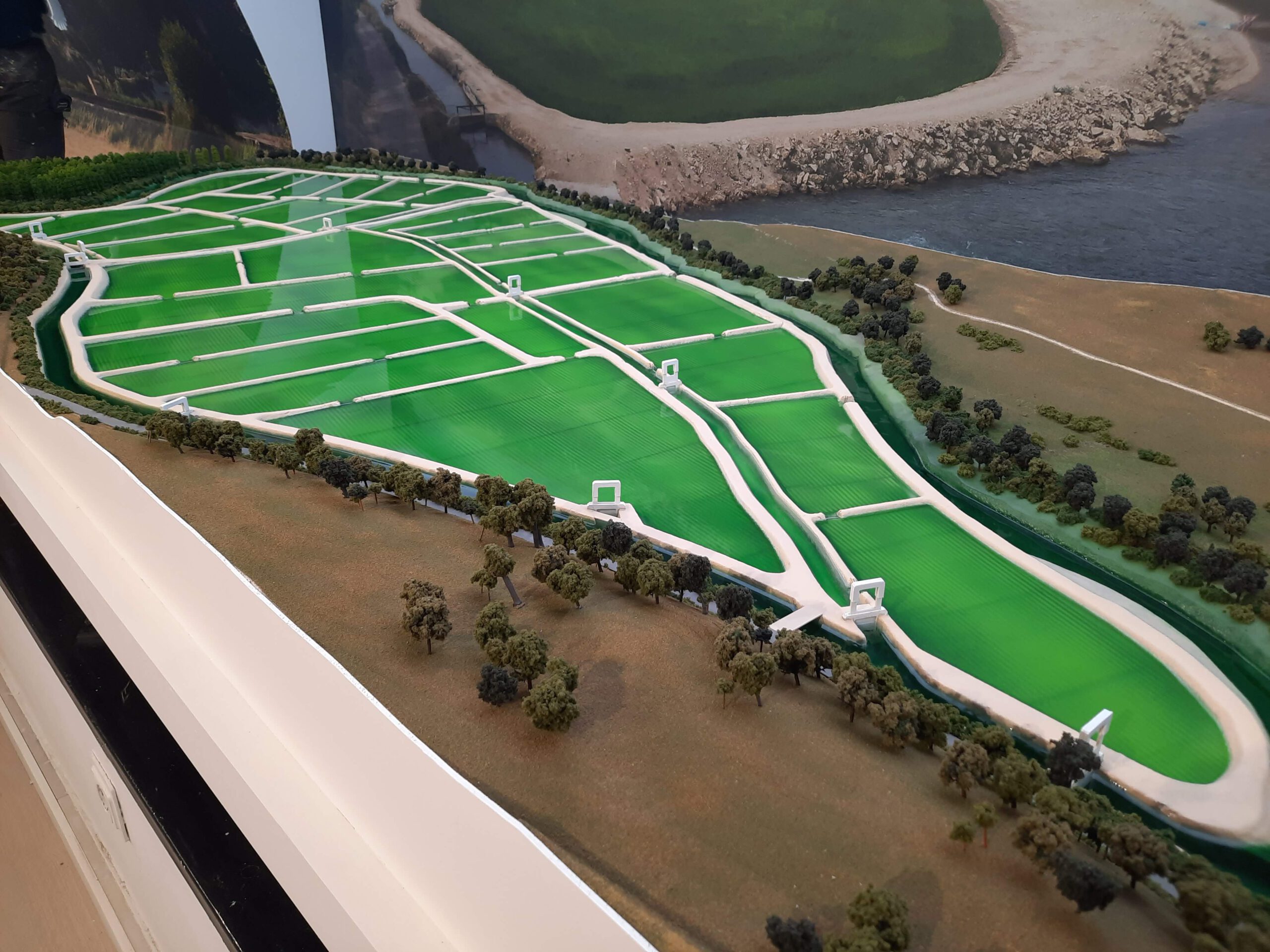La maqueta es una representación a escala de un proyecto de planificación agrícola que destaca la distribución y el sistema de irrigación de unos arrozales en un entorno ribereño y boscoso pegado al rio Segura. El agua discurre por el rio y mediante compuertas va entrando en los diferentes campos.