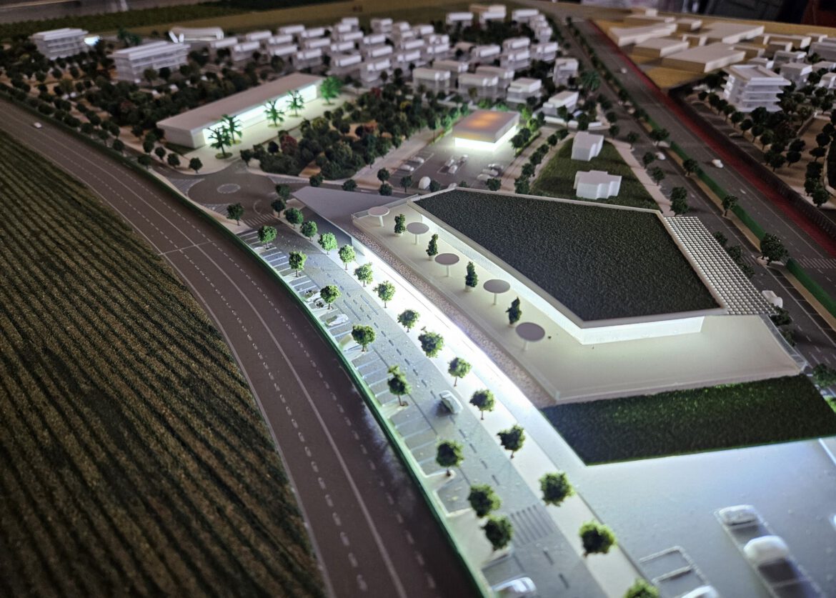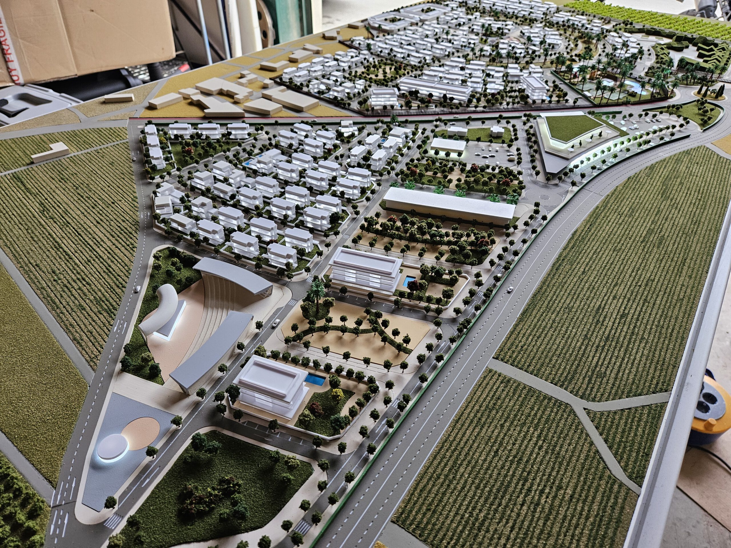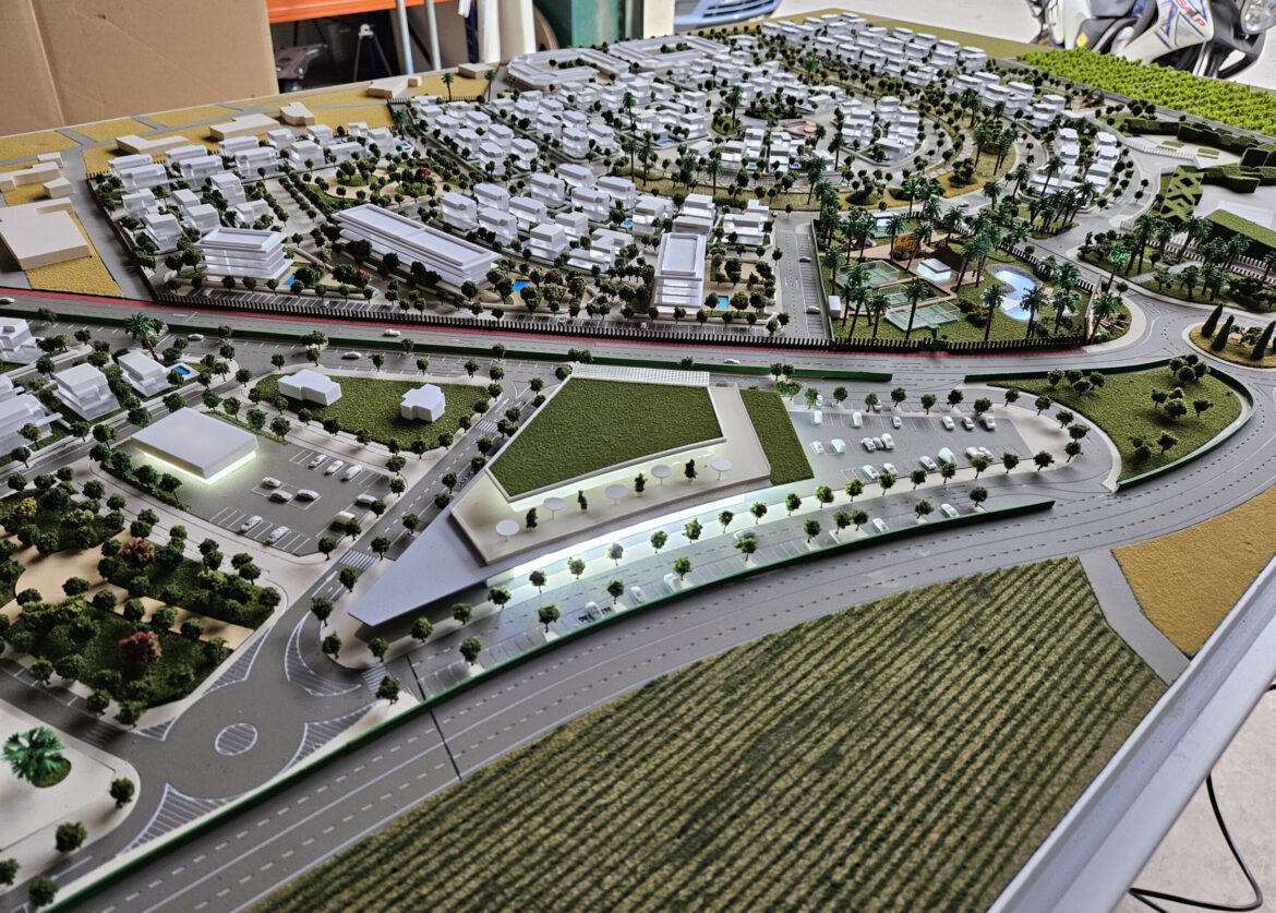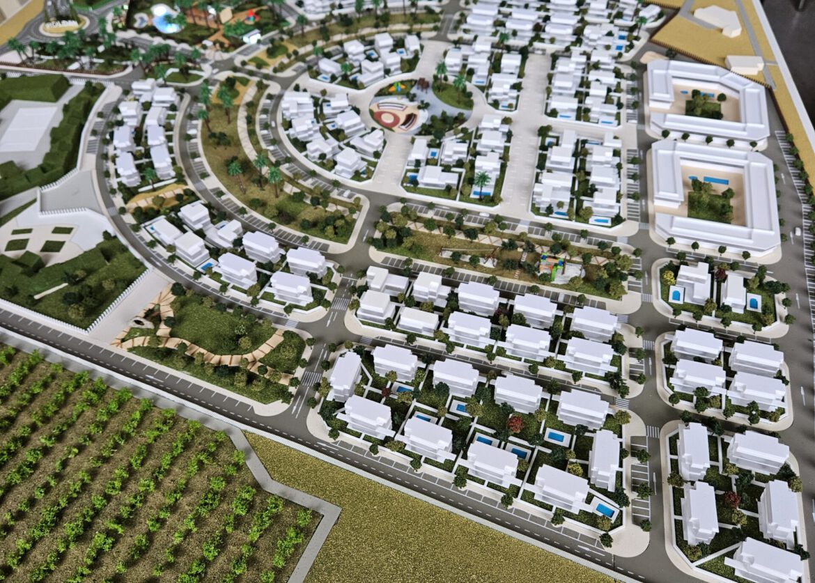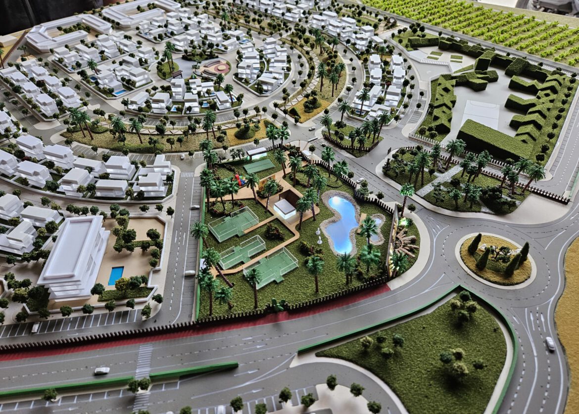Esta es una maqueta de urbanismo a escala que representa un gran proyecto de desarrollo residencial, probablemente un complejo vacacional o una comunidad planificada.